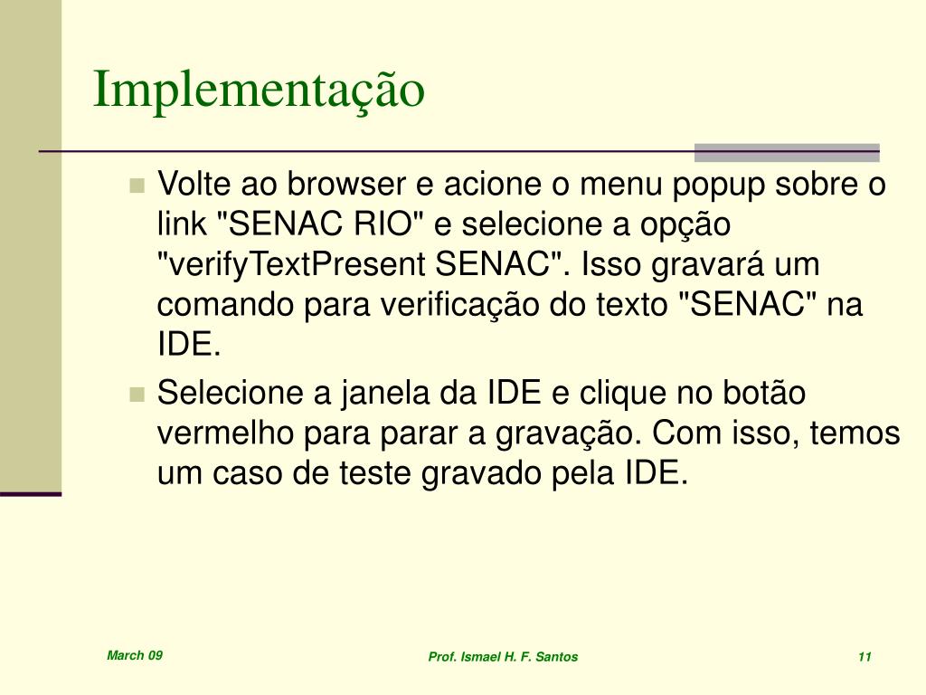 Implementação • Volte ao browser e acione o menu popup sobre o link "SENAC RIO" e selecione a opção "verifyTextPresent SENAC". Isso gravará um comando para verificação do texto "SENAC" na IDE. • Selecione a janela da IDE e clique no botão vermelho para parar a gravação. Com isso, temos um caso de teste gravado pela IDE. Prof. Ismael H. F. Santos 11