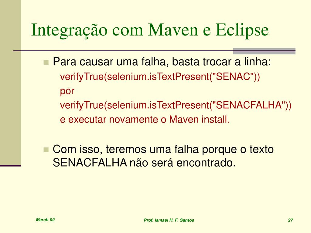 Integração com Maven e Eclipse • Abra o Selenium IDE novamente no Firefox. • Abra o arquivo "teste.selenium" anteriormente gravado. • Selecione o menu File > Export Test Case As... > Java - Selenium RC. • Salve como TesteSelenium.java em qualquer pasta. • Copie o arquivo TesteSelenium.java para o Eclipse na pasta src/test/java no pacote br.senac e abra o arquivo no editor do Eclipse. • Mude a package para br.senac Prof. Ismael H. F. Santos 25