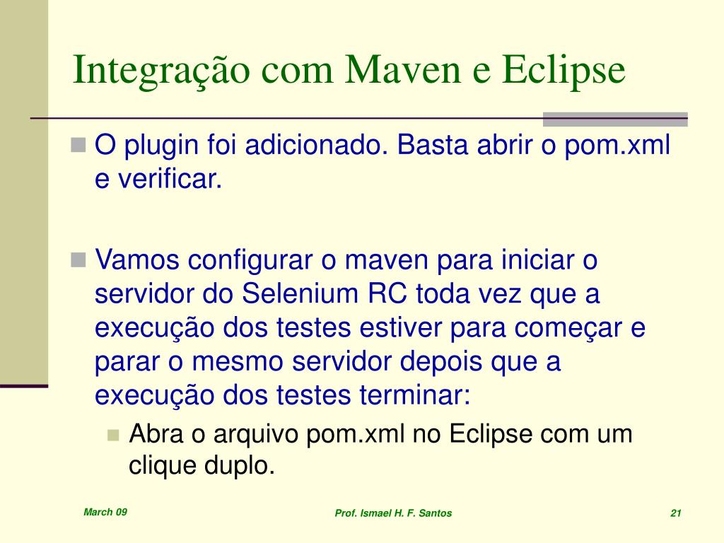 Integração com Maven e Eclipse • Em Artifact Id, digite "testeSelenium" • Em Package, digite "br.senac" • Clique em Finish para criar o projeto. • Adicione o plugin do Selenium: • Clique com o botão direito do mouse sobre o projeto e acesse o menu Maven > Add Plugin. • Digite "selenium" para filtrar a lista de plugins. • Selecione "org.codehaus.mojo selenium-maven-plugin". • Clique em Ok. Prof. Ismael H. F. Santos 20