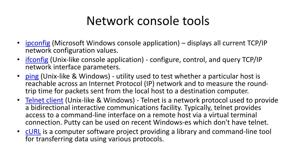 Network console tools • ipconfig (Microsoft Windows console application) – displays all current TCP/IP network configuration values. • ifconfig (Unix-like console application) - configure, control, and query TCP/IP network interface parameters. • ping (Unix-like & Windows) - utility used to test whether a particular host is reachable across an Internet Protocol (IP) network and to measure the round-trip time for packets sent from the local host to a destination computer. • Telnet client (Unix-like & Windows) - Telnet is a network protocol used to provide a bidirectional interactive communications facility. Typically, telnet provides access to a command-line interface on a remote host via a virtual terminal connection. Putty can be used on recent Windows-es which don't have telnet. • cURL is a computer software project providing a library and command-line tool for transferring data using various protocols.