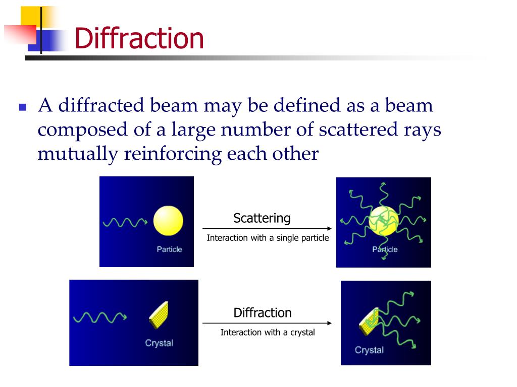 Scattering Interaction with a single particle Diffraction Interaction with a crystal Diffraction • A diffracted beam may be defined as a beam composed of a large number of scattered rays mutually reinforcing each other