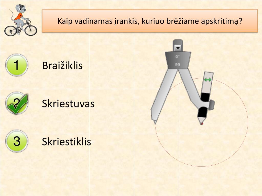 Kaip vadinamas įrankis, kuriuo brėžiame apskritimą? Braižiklis Skriestuvas Skriestiklis