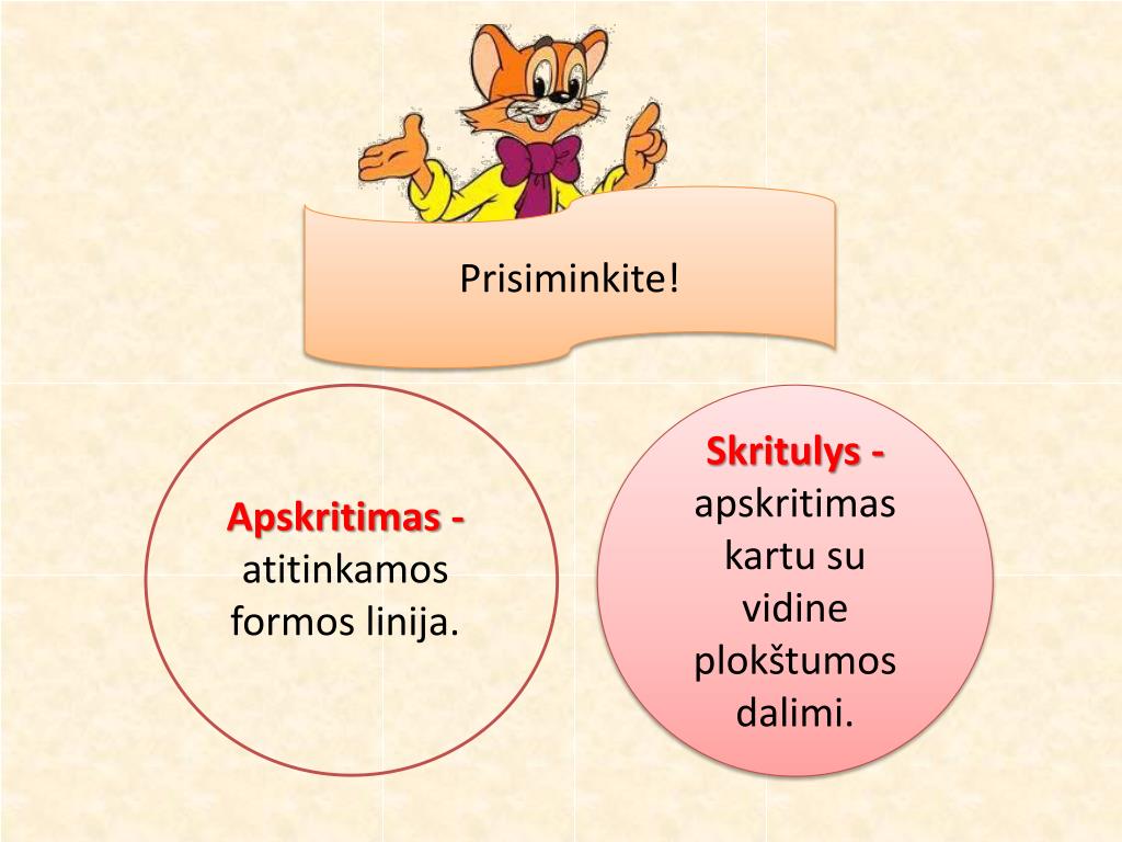 Prisiminkite! Skritulys -apskritimas kartu su vidine plokštumos dalimi. • Apskritimas - atitinkamos formos linija.
