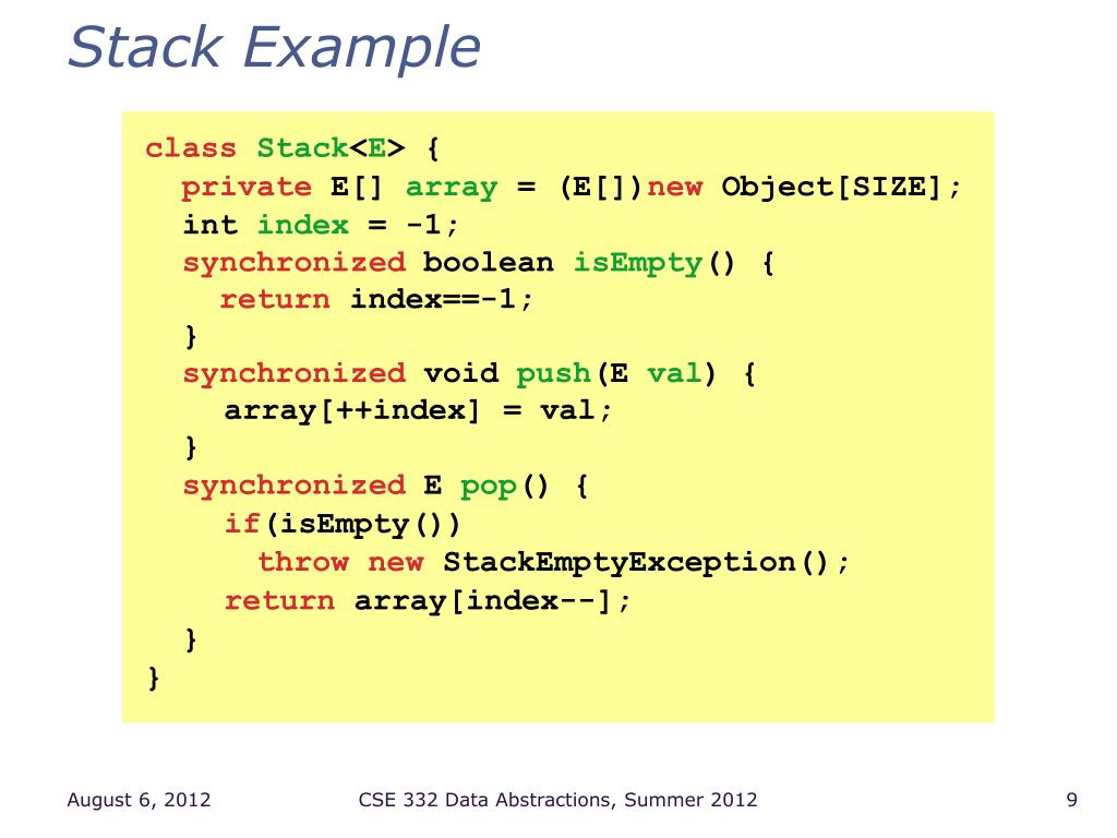 Stack Example classStack<E> { private E[] array = (E[])new Object[SIZE]; intindex = -1; synchronized booleanisEmpty() { return index==-1; } synchronized void push(E val) { array[++index] = val; } synchronized E pop() { if(isEmpty()) throw newStackEmptyException(); return array[index--]; } } CSE 332 Data Abstractions, Summer 2012