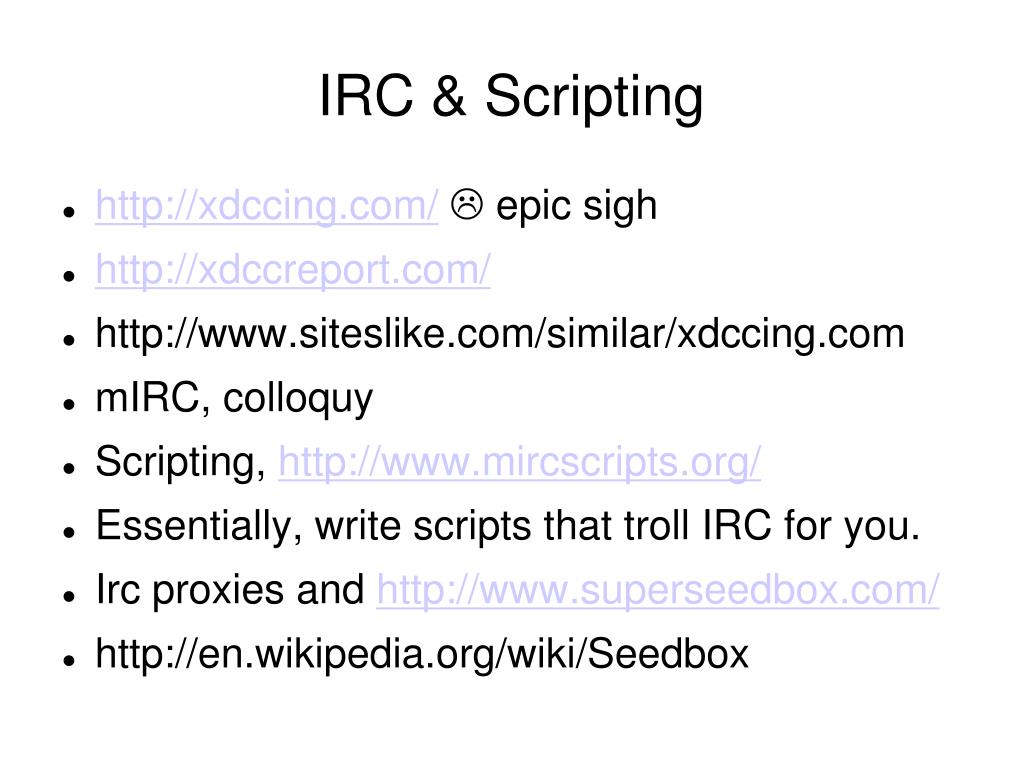 IRC & Scripting • http://xdccing.com/ epic sigh • http://xdccreport.com/ • http://www.siteslike.com/similar/xdccing.com • mIRC, colloquy • Scripting, http://www.mircscripts.org/ • Essentially, write scripts that troll IRC for you. • Irc proxies and http://www.superseedbox.com/ • http://en.wikipedia.org/wiki/Seedbox