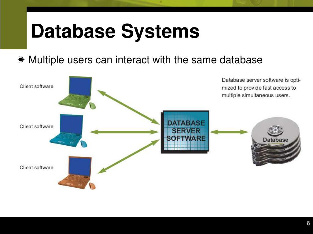 Benefits of Using a DBMS • Enter data quickly and easily. • Organize records in different and useful ways. • Locate records quickly. • Eliminate redundant data. • Create queries for specific data. • Create reports.