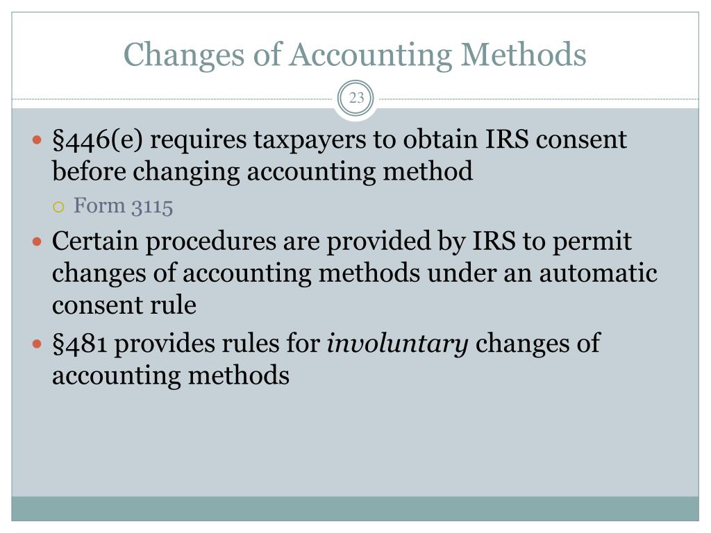 Changes of Accounting Methods • §446(e) requires taxpayers to obtain IRS consent before changing accounting method • Form 3115 • Certain procedures are provided by IRS to permit changes of accounting methods under an automatic consent rule • §481 provides rules for involuntary changes of accounting methods