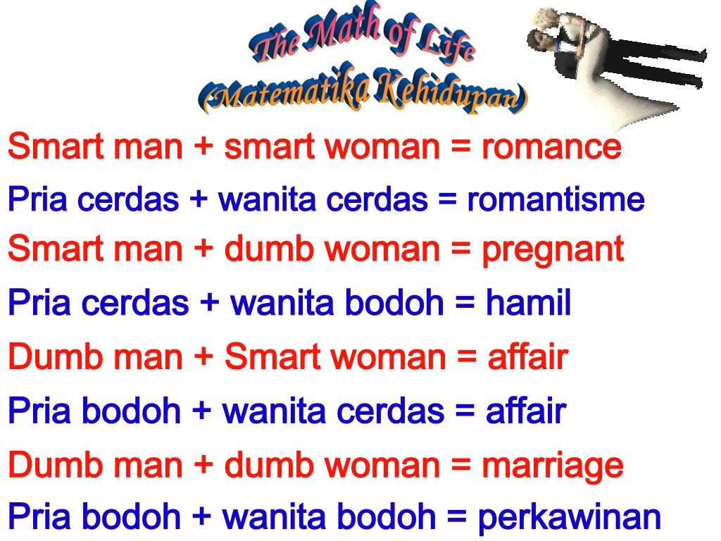 The Math of Life (Matematika Kehidupan) Smart man + smart woman = romance Pria cerdas + wanita cerdas = romantisme Smart man + dumb woman = pregnant Pria cerdas + wanita bodoh = hamil Dumb man + Smart woman = affair Pria bodoh + wanita cerdas = affair Dumb man + dumb woman = marriage Pria bodoh + wanita bodoh = perkawinan