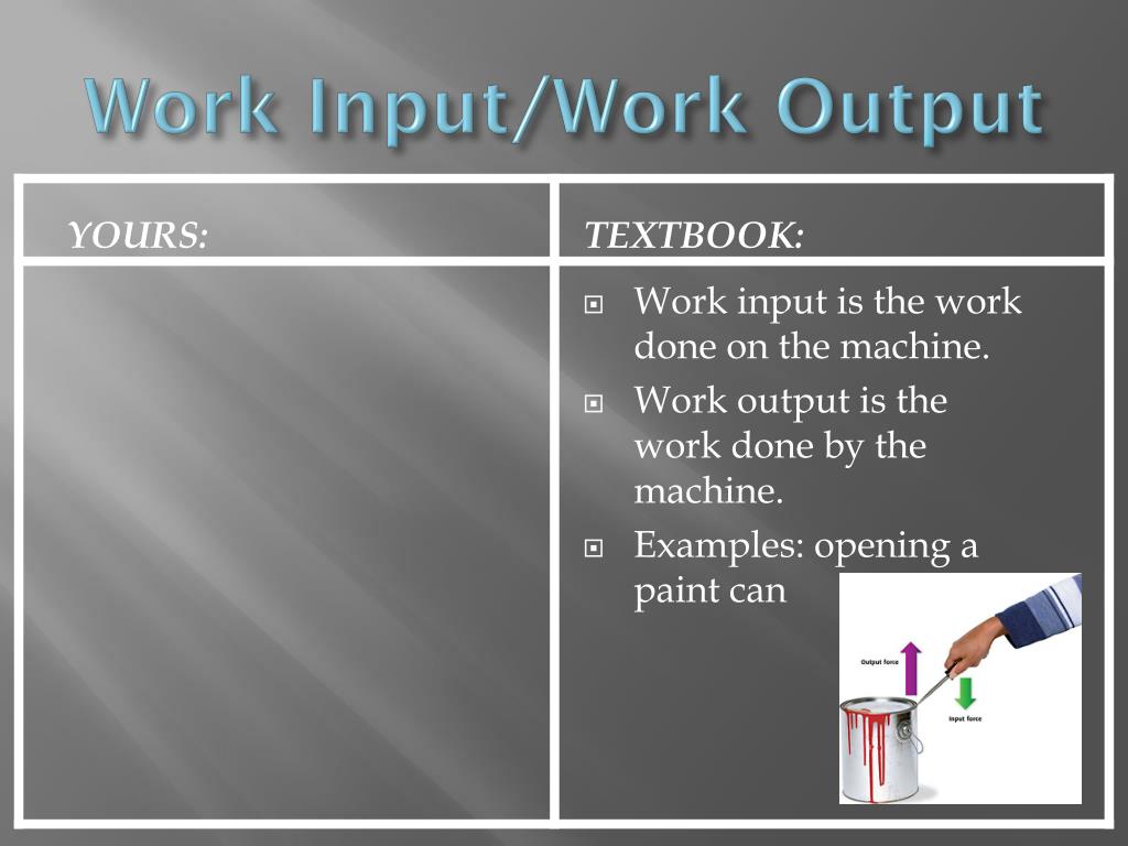 Work Input/Work Output YOURS: textbook: • Work input is the work done on the machine. • Work output is the work done by the machine. • Examples: opening a paint can
