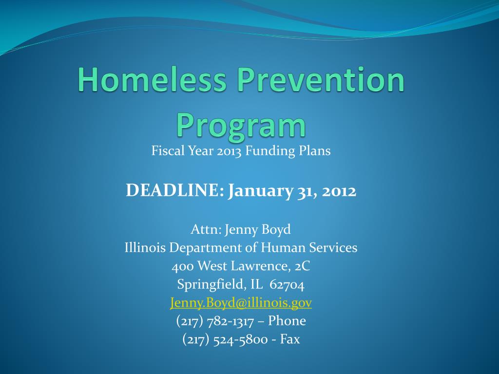Homeless Prevention Program Fiscal Year 2013 Funding Plans DEADLINE: January 31, 2012 Attn: Jenny Boyd Illinois Department of Human Services 400 West Lawrence, 2C Springfield, IL 62704 Jenny.Boyd@illinois.gov (217) 782-1317 – Phone (217) 524-5800 - Fax