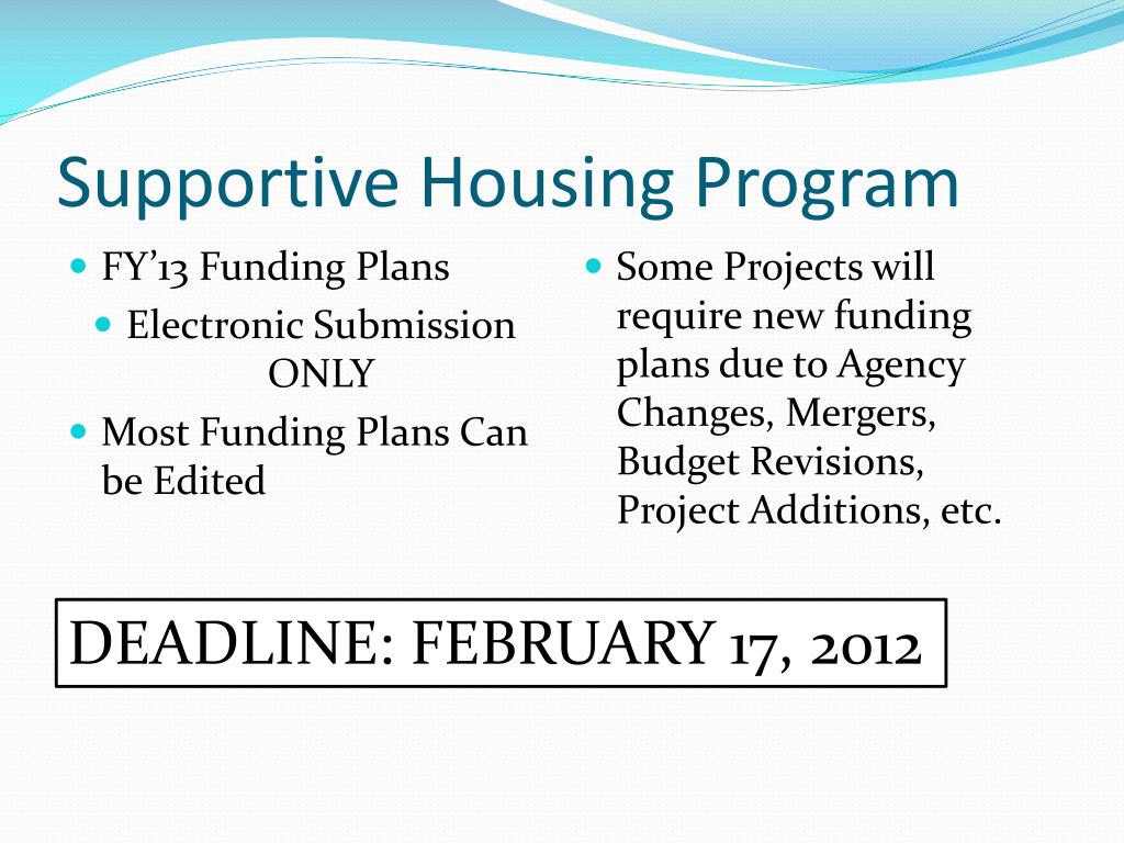 Supportive Housing Program • FY’13 Funding Plans • Electronic Submission ONLY • Most Funding Plans Can be Edited • Some Projects will require new funding plansdue to Agency Changes, Mergers, Budget Revisions, Project Additions, etc. DEADLINE: FEBRUARY 17, 2012