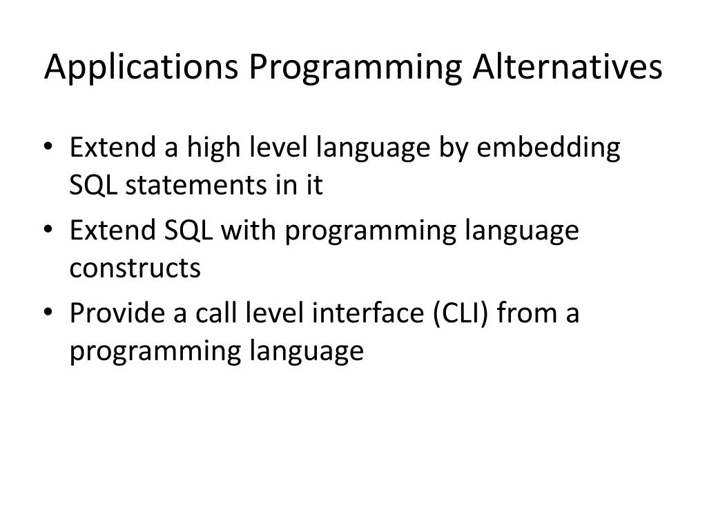 Applications Programming Alternatives • Extend a high level language by embedding SQL statements in it • Extend SQL with programming language constructs • Provide a call level interface (CLI) from a programming language