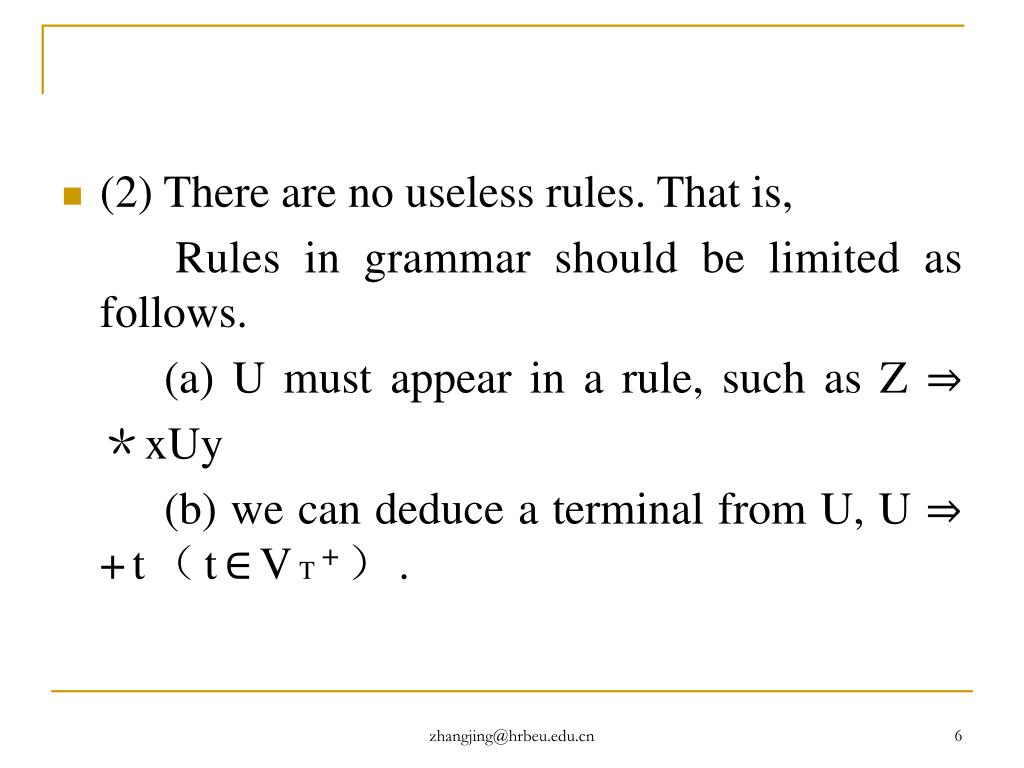 (2) There are no useless rules. That is, Rules in grammar should be limited as follows. . (a) U must appear in a rule, such as Z ⇒ *xUy . (b) we can deduce a terminal from U, U ⇒+t(t∈VT+). . zhangjing@hrbeu.edu.cn