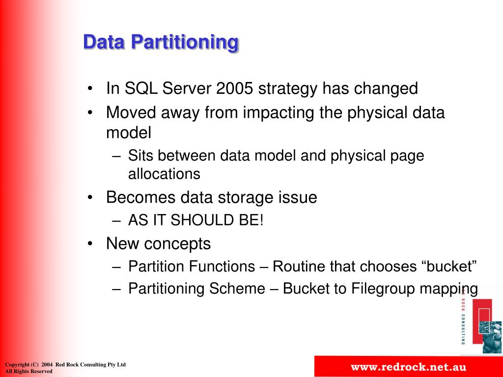 Data Partitioning • In SQL Server 2005 strategy has changed • Moved away from impacting the physical data model • Sits between data model and physical page allocations • Becomes data storage issue • AS IT SHOULD BE! • New concepts • Partition Functions – Routine that chooses “bucket” • Partitioning Scheme – Bucket to Filegroup mapping