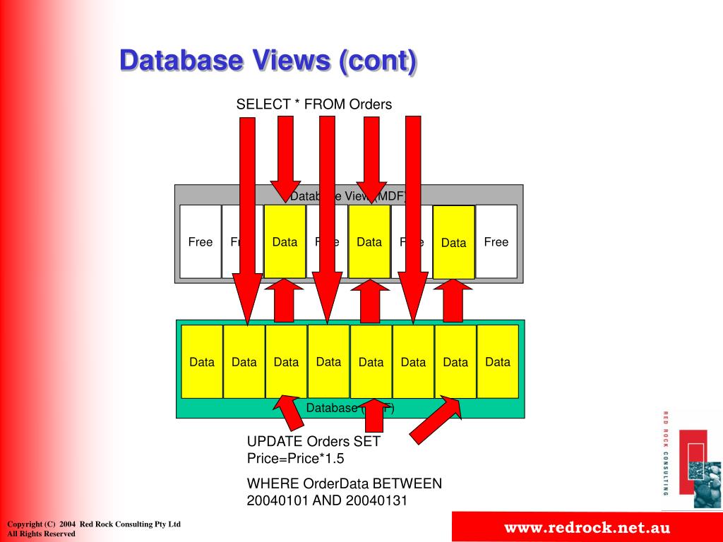 Database Views (cont) SELECT * FROM Orders WHERE ORDERID=100 Database View (MDF) Free Free Free Free Free Free Free Free Database (MDF) Data Data Data Data Data Data Data Data