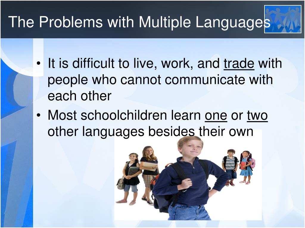 The Problems with Multiple Languages • It is difficult to live, work, and trade with people who cannot communicate with each other • Most schoolchildren learn one or two other languages besides their own