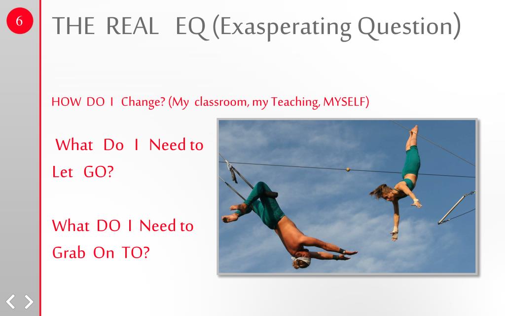 THE REAL EQ (Exasperating Question) 6 HOW DO I Change? (My classroom, my Teaching, MYSELF) What Do I Need to Let GO? What DO I Need to Grab On TO?