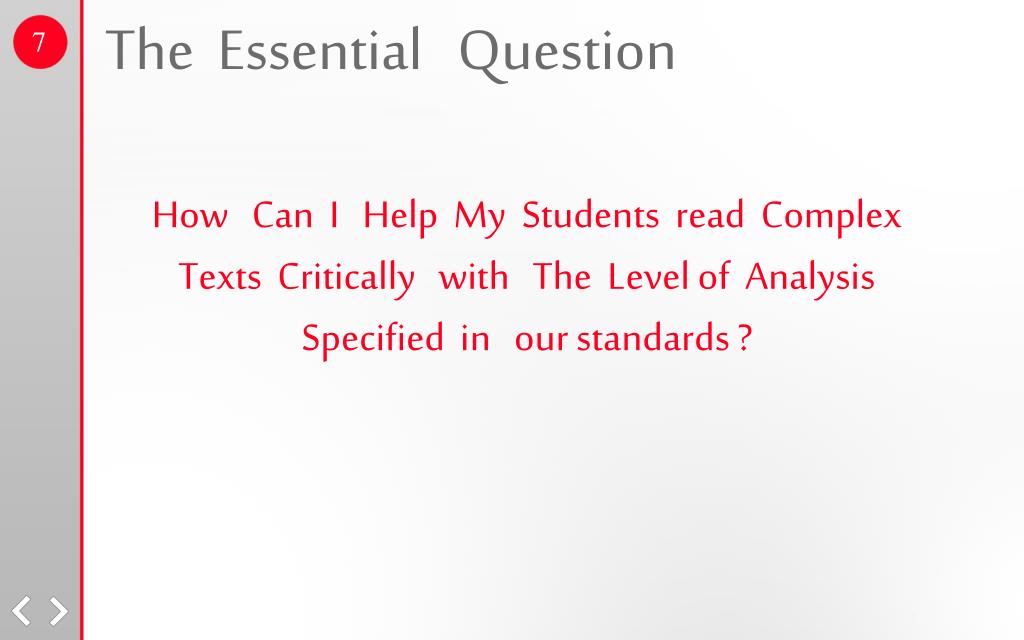 The Essential Question 7 How Can I Help My Students read Complex Texts Critically with The Level of Analysis Specified in our standards ?
