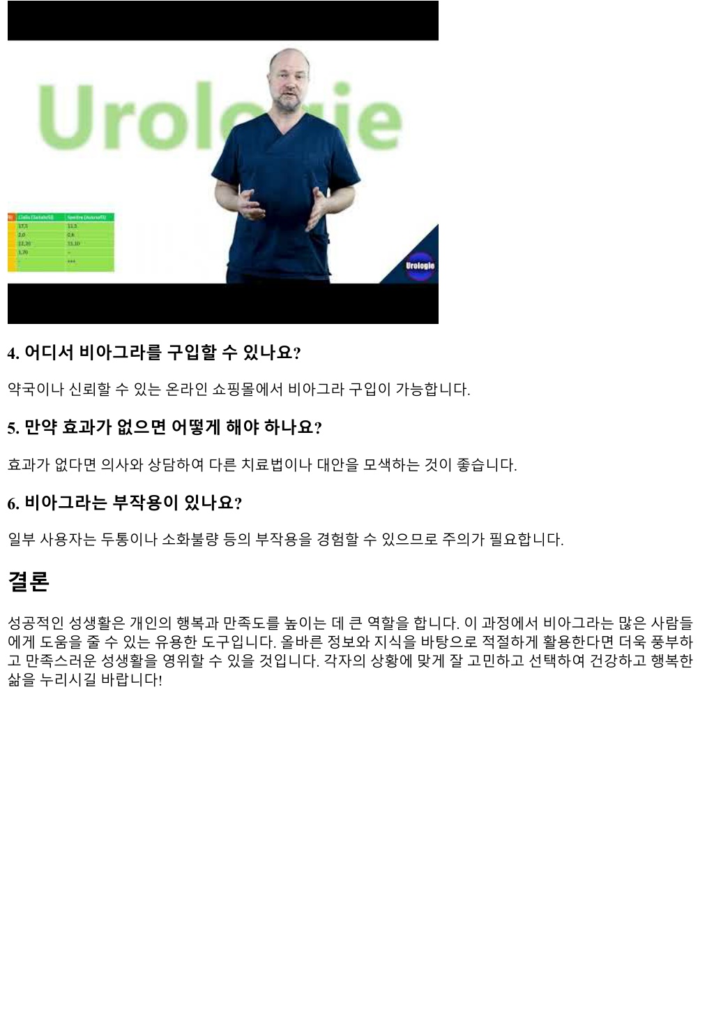 2. 4. 어디서비아그라를구입할수있나요? 약국이나신뢰할수있는온라인쇼핑몰에서비아그라구입이가능합니다. 5. 만약효과가없으면어떻게해야하나요? 효과가없다면의사와상담하여다른치료법이나대안을모색하는것이좋습니다. 6. 비아그라는부작용이있나요? 일부사용자는두통이나소화불량등의부작용을경험할수있으므로주의가필요합니다. 결론 성공적인성생활은개인의행복과만족도를높이는데큰역할을합니다. 이과정에서비아그라는많은사람들 에게도움을줄수있는유용한도구입니다. 올바른정보와지식을바탕으로적절하게활용한다면더욱풍부하 고만족스러운성생활을영위할수있을것입니다. 각자의상황에맞게잘고민하고선택하여건강하고행복한 삶을누리시길바랍니다!