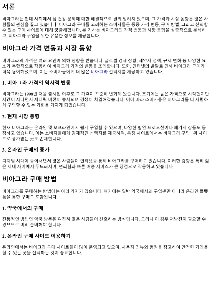 2. 3. 처방전필요없는옵션 최근몇몇웹사이트에서는처방전필요없는비아그라와같은옵션도제공하고있어소비자들에게더큰편의를 제공합니다. 비아그라관련자주묻는질문 (FAQs) Q1: 비아그라는어디서구입할수있나요? A1: 비아그라는약국및다양한온라인플랫폼에서구입할수있습니다. Q2: 비아그라가격은어떻게결정되나요? A2: 비아그라가격은제약사정책, 생산비용및시장경쟁에따라달라집니다. Q3: 어떤웹사이트가가장안전한비아гра 구매사이트인가요? A3: 사용자리뷰와평점을기반으로신뢰할수있는웹사이트를선택하는것이중요합니다. Q4: 처방전없이도비아그라를받을수있나요? A4: 일부웹사이트에서는처방전필요없는비아그라옵션을제공하지만, 반드시신뢰할수있는곳인지확인해 야합니다. Q5: 왜비아그라는이렇게인기가높나요? A5: 성건강문제해결에효과적이며접근성이좋아점점더많은사람들이사용하고있기때문입니다. Q6: 최근의시장동향은어떤가요? A6: 최근몇년간온라인판매가증가하면서경쟁이치열해지고있으며, 이에따라가격도다양하게형성되고 있습니다. 결론
