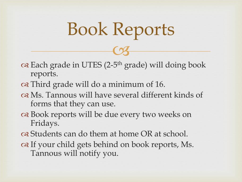 Book Reports • Each grade in UTES (2-5th grade) will doing book reports. • Third grade will do a minimum of 16. • Ms. Tannous will have several different kinds of forms that they can use. • Book reports will be due every two weeks on Fridays. • Students can do them at home OR at school. • If your child gets behind on book reports, Ms. Tannous will notify you.