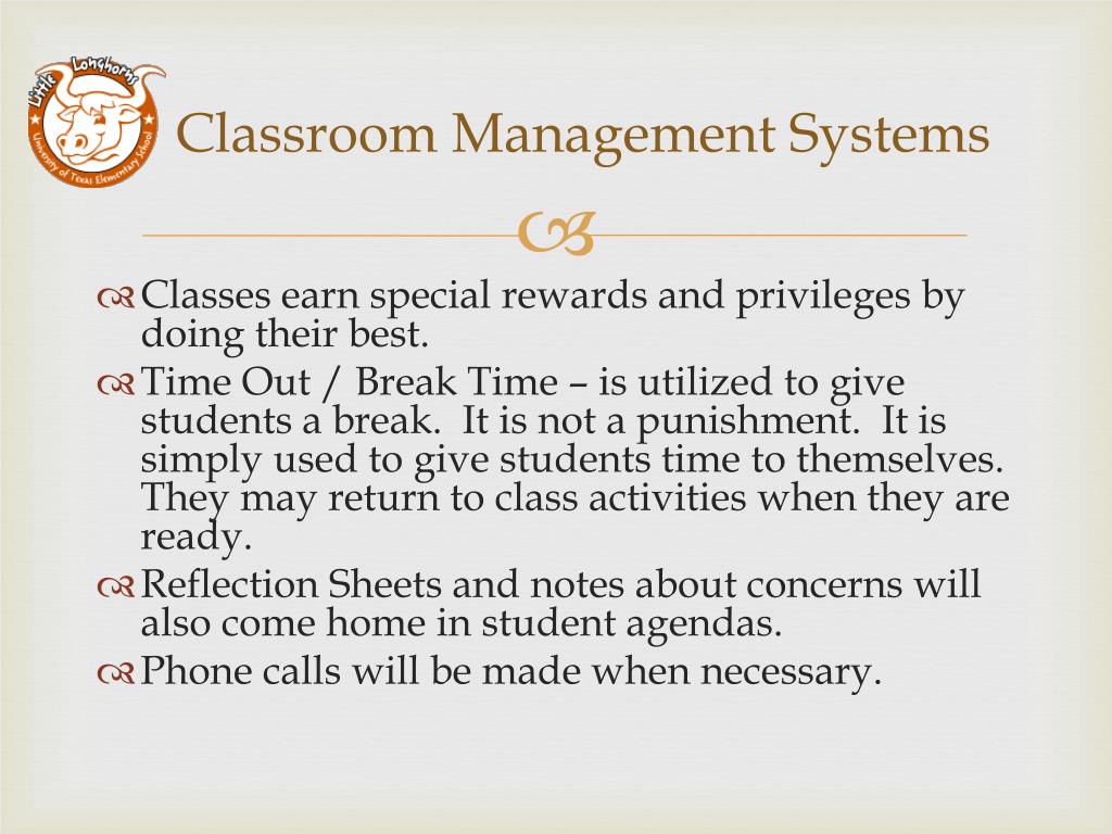 Classroom Management Systems • Classes earn special rewards and privileges by doing their best. • Time Out / Break Time – is utilized to give students a break. It is not a punishment. It is simply used to give students time to themselves. They may return to class activities when they are ready. • Reflection Sheets and notes about concerns will also come home in student agendas. • Phone calls will be made when necessary.