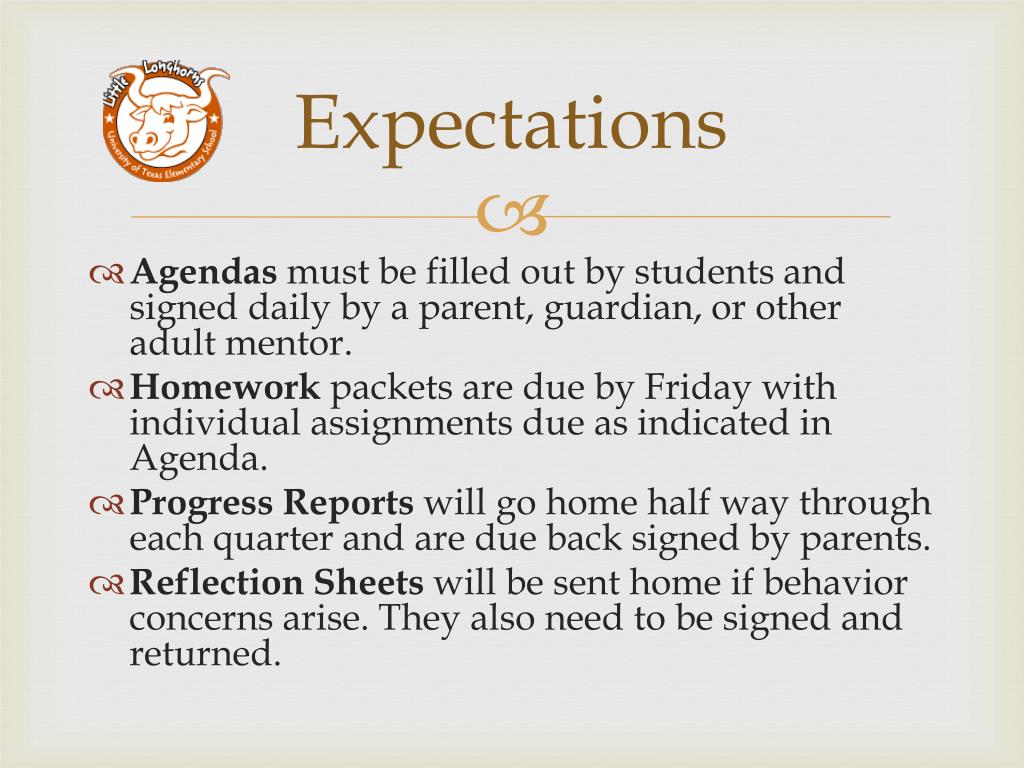 Expectations • Agendas must be filled out by students and signed daily by a parent, guardian, or other adult mentor. • Homework packets are due by Friday with individual assignments due as indicated in Agenda. • Progress Reports will go home half way through each quarter and are due back signed by parents. • Reflection Sheets will be sent home if behavior concerns arise. They also need to be signed and returned.