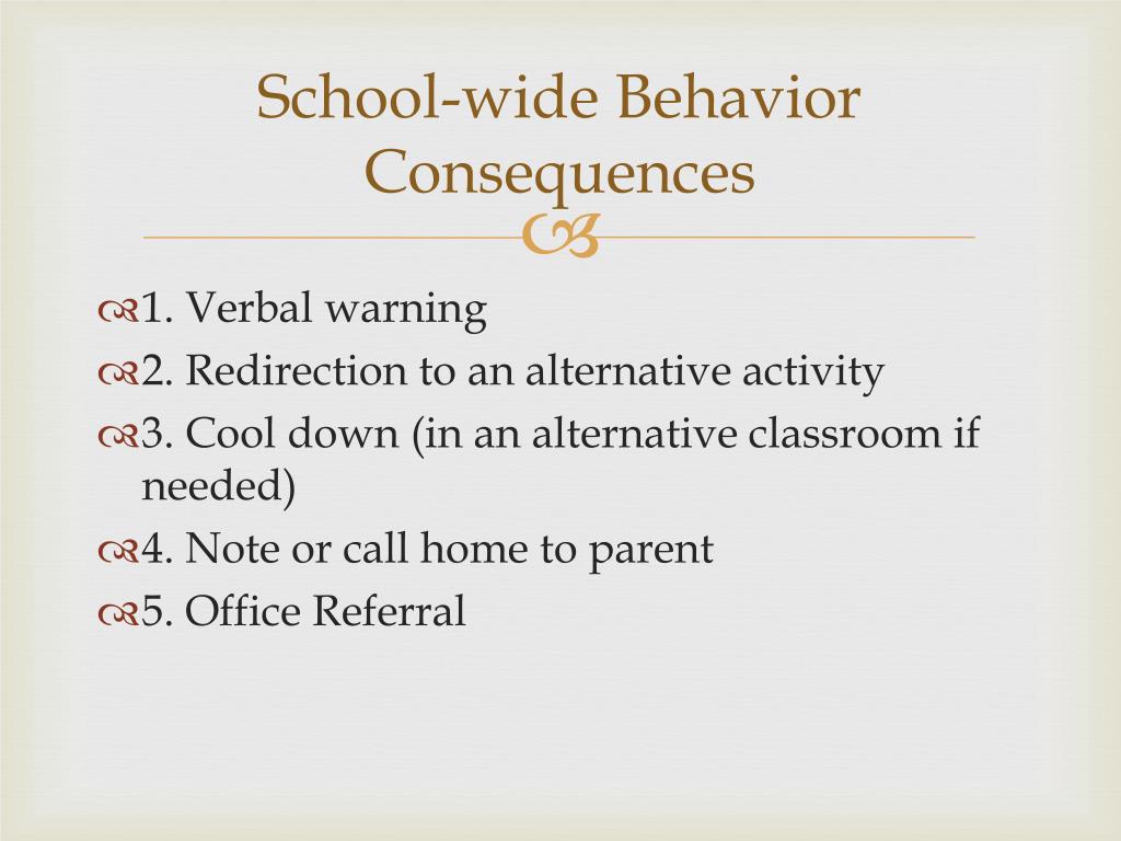 School-wide Behavior Consequences • 1. Verbal warning • 2. Redirection to an alternative activity • 3. Cool down (in an alternative classroom if needed) • 4. Note or call home to parent • 5. Office Referral