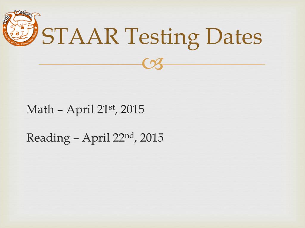 STAAR Testing Dates Math – April 21st, 2015 Reading – April 22nd, 2015