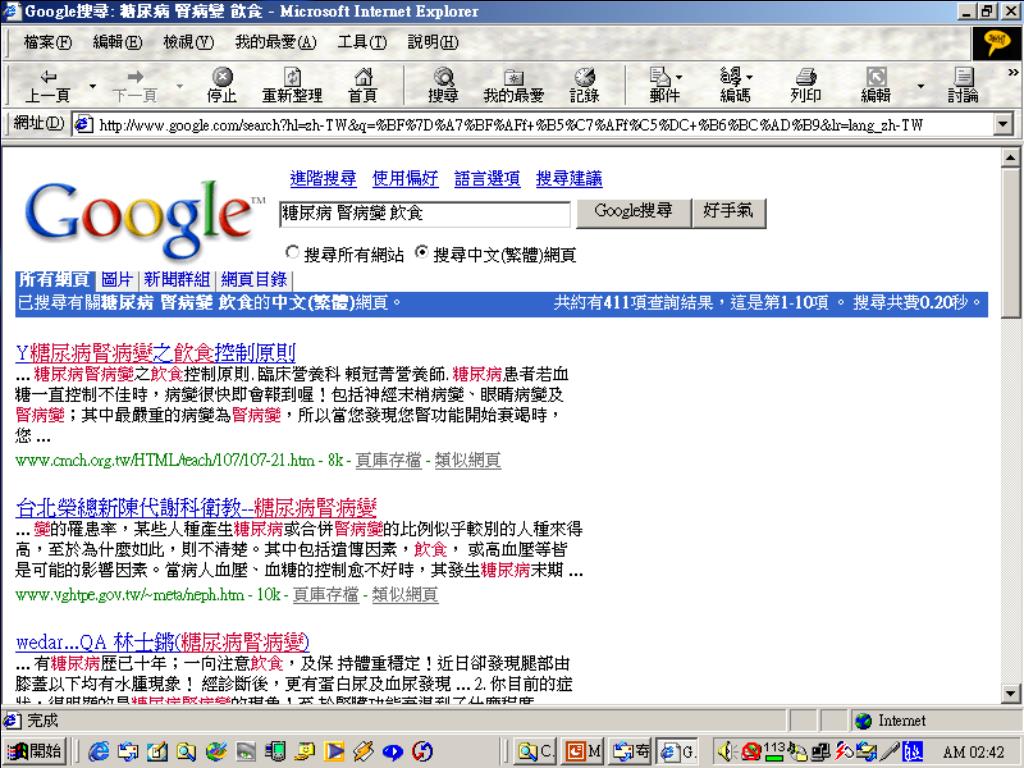 一般性資料檢索-中文 • Googlehttp://www.google.com/ • GAIS (Global Area Information Servers) http://gais.cs.ccu.edu.tw/ • 蕃薯藤http://www.yam.com.tw/ • PCHomehttp://www.pchome.com.tw/ • Yahoo奇摩http://www.yahoo.com.tw/ • 新浪網http://www.sina.com.tw/
