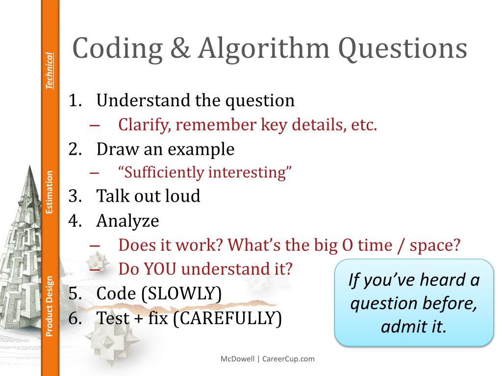 How To Solve Algorithm Questions Compare to similar problems. Solve first for a simplified / tweaked problem. Solve for n = 1, and build solution for n = 2. Try to apply data structure to solve problem. McDowell | CareerCup.com