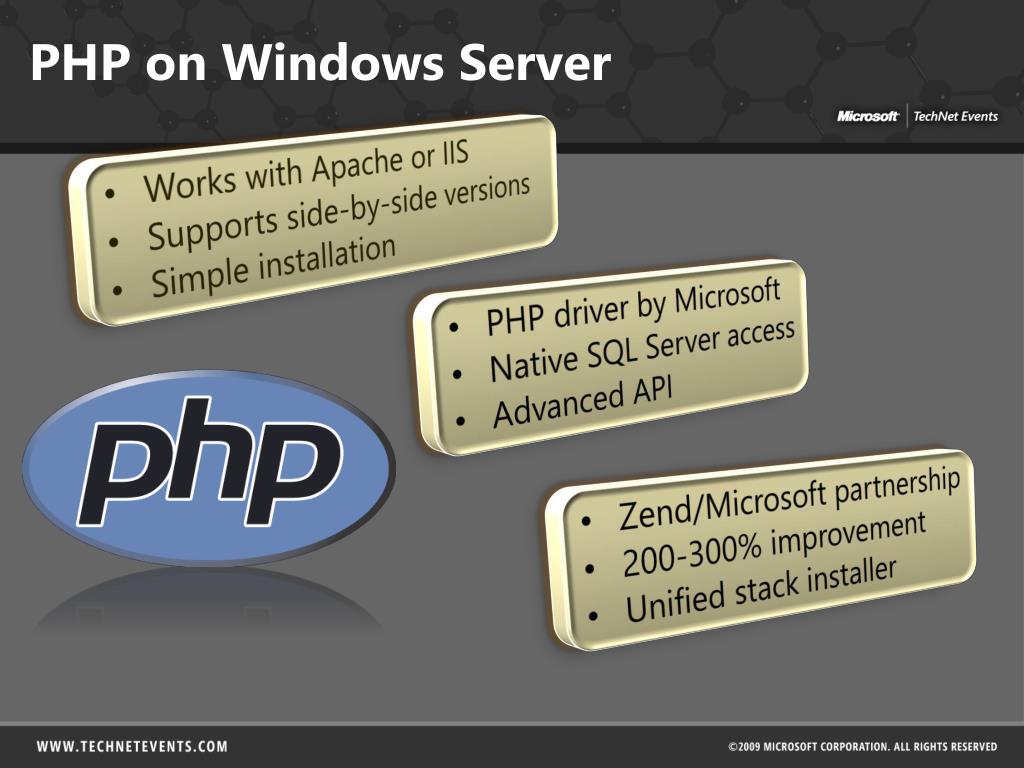 PHP on Windows Server • Works with Apache or IIS • Supports side-by-side versions • Simple installation • PHP driver by Microsoft • Native SQL Server access • Advanced API • Zend/Microsoft partnership • 200-300% improvement • Unified stack installer