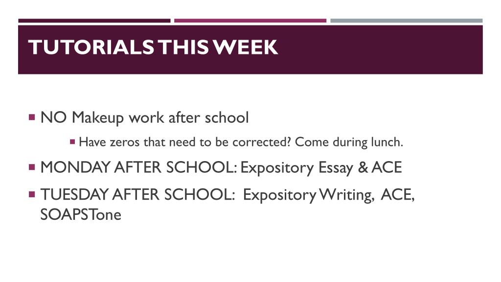 TUTORIALS THIS WEEK • NO Makeup work after school • Have zeros that need to be corrected? Come during lunch. • MONDAY AFTER SCHOOL: Expository Essay & ACE • TUESDAY AFTER SCHOOL: Expository Writing, ACE, SOAPSTone