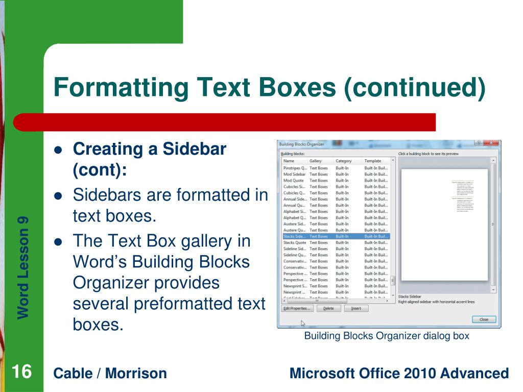 Formatting Text Boxes (continued) • Creating a Sidebar(cont): • Sidebars are formatted in text boxes. • The Text Box gallery in Word’s Building Blocks Organizer provides several preformatted text boxes. Building Blocks Organizer dialog box