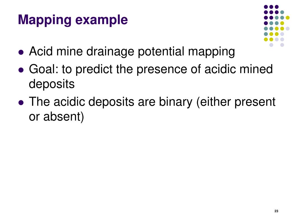 Mapping example • Acid mine drainage potential mapping • Goal: to predict the presence of acidic mined deposits • The acidic deposits are binary (either present or absent)