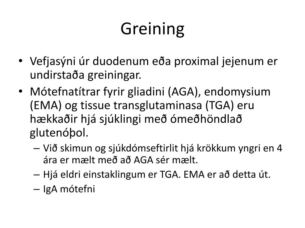 Greining • Vefjasýni úr duodenum eða proximal jejenum er undirstaða greiningar. • Mótefnatítrar fyrir gliadini (AGA), endomysium (EMA) og tissue transglutaminasa (TGA) eru hækkaðir hjá sjúklingi með ómeðhöndlað glutenóþol. • Við skimun og sjúkdómseftirlit hjá krökkum yngri en 4 ára er mælt með að AGA sér mælt. • Hjá eldri einstaklingum er TGA. EMA er að detta út. • IgA mótefni