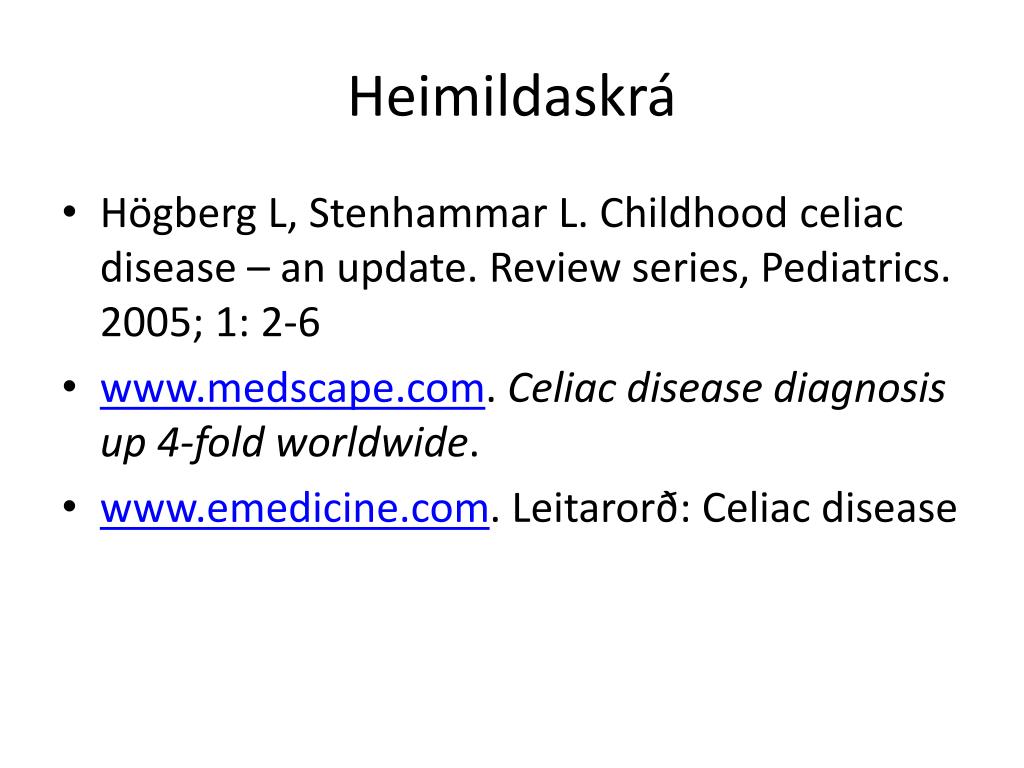 Heimildaskrá • Högberg L, Stenhammar L. Childhood celiac disease – an update. Review series, Pediatrics. 2005; 1: 2-6 • www.medscape.com. Celiac disease diagnosis up 4-fold worldwide. • www.emedicine.com. Leitarorð: Celiac disease