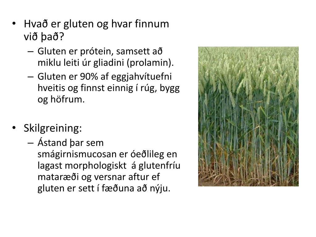 Hvað er gluten og hvar finnum við það? • Gluten er prótein, samsett að miklu leiti úr gliadini (prolamin). • Gluten er 90% af eggjahvítuefni hveitis og finnst einnig í rúg, bygg og höfrum. • Skilgreining: • Ástand þar sem smágirnismucosan er óeðlileg en lagast morphologiskt á glutenfríu mataræði og versnar aftur ef gluten er sett í fæðuna að nýju.