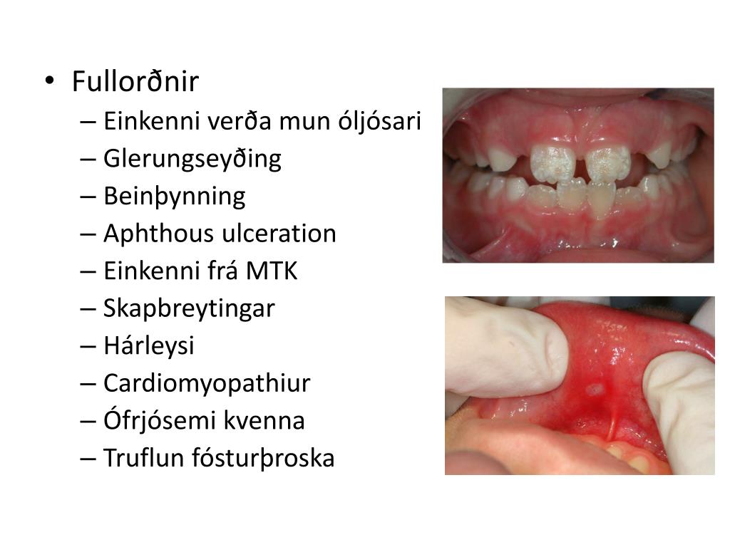 Fullorðnir • Einkenni verða mun óljósari • Glerungseyðing • Beinþynning • Aphthous ulceration • Einkenni frá MTK • Skapbreytingar • Hárleysi • Cardiomyopathiur • Ófrjósemi kvenna • Truflun fósturþroska