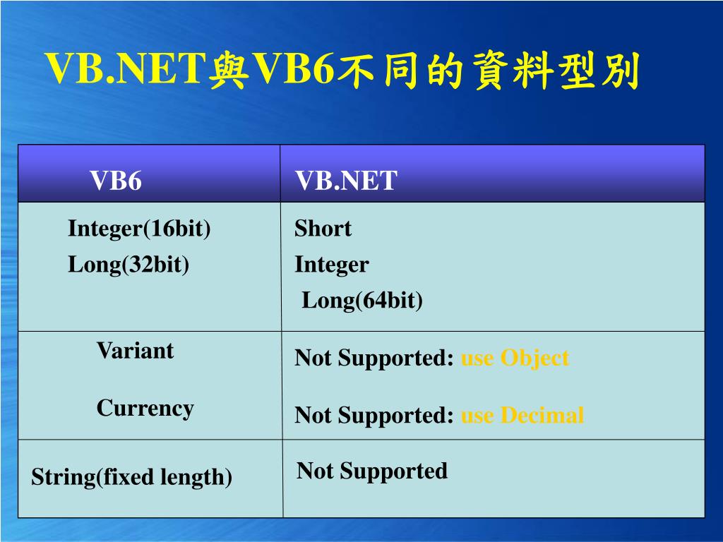VB.NET與VB6不同的資料型別 VB6 VB.NET Integer(16bit) Short Long(32bit) Integer Long(64bit) Variant Not Supported: use Object Currency Not Supported: use Decimal Not Supported String(fixed length)