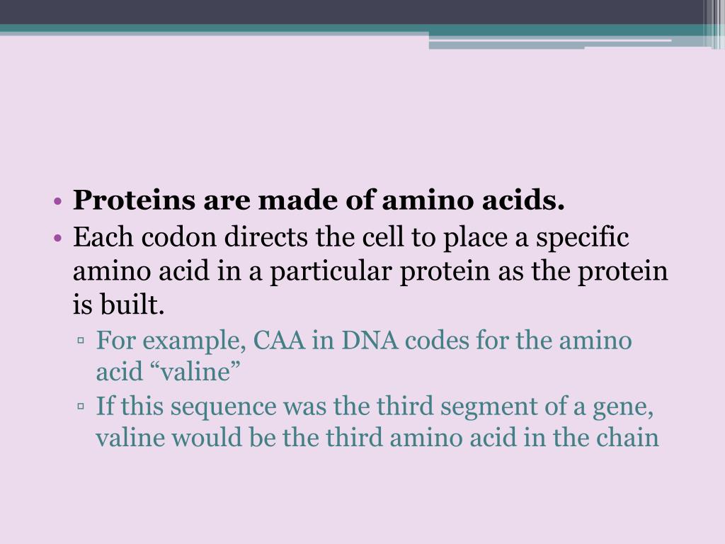 Proteins are made of amino acids. • Each codon directs the cell to place a specific amino acid in a particular protein as the protein is built. • For example, CAA in DNA codes for the amino acid “valine” • If this sequence was the third segment of a gene, valine would be the third amino acid in the chain