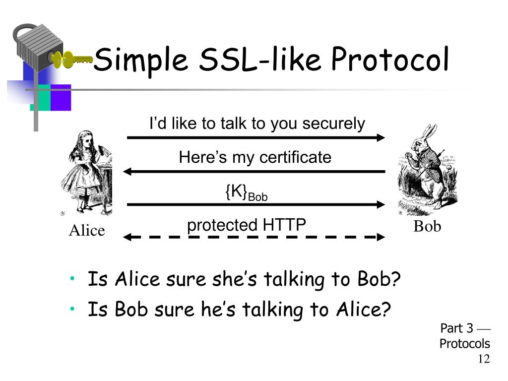 Simple SSL-like Protocol • Is Alice sure she’s talking to Bob? • Is Bob sure he’s talking to Alice? I’d like to talk to you securely Here’s my certificate {K}Bob protected HTTP Bob Alice Part 3 Protocols 12