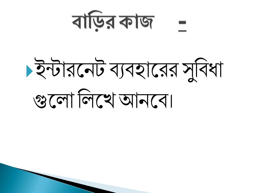 বাড়ির কাজ - • ইন্টারনেট ব্যবহারের সুবিধা গুলো লিখে আনবে।