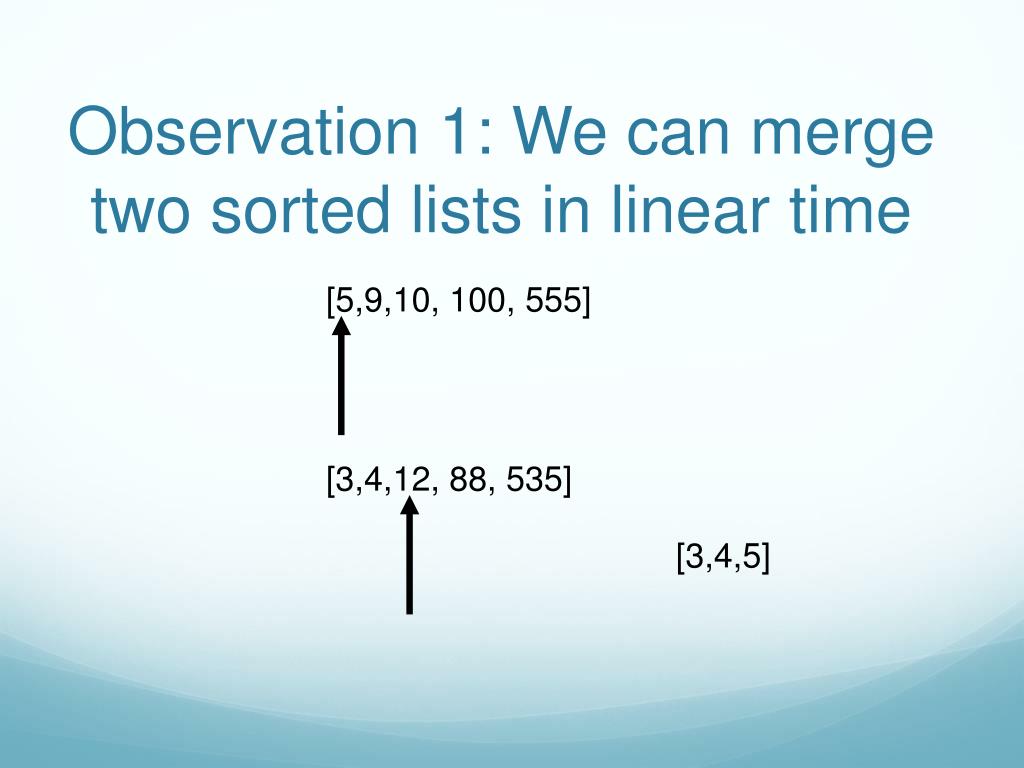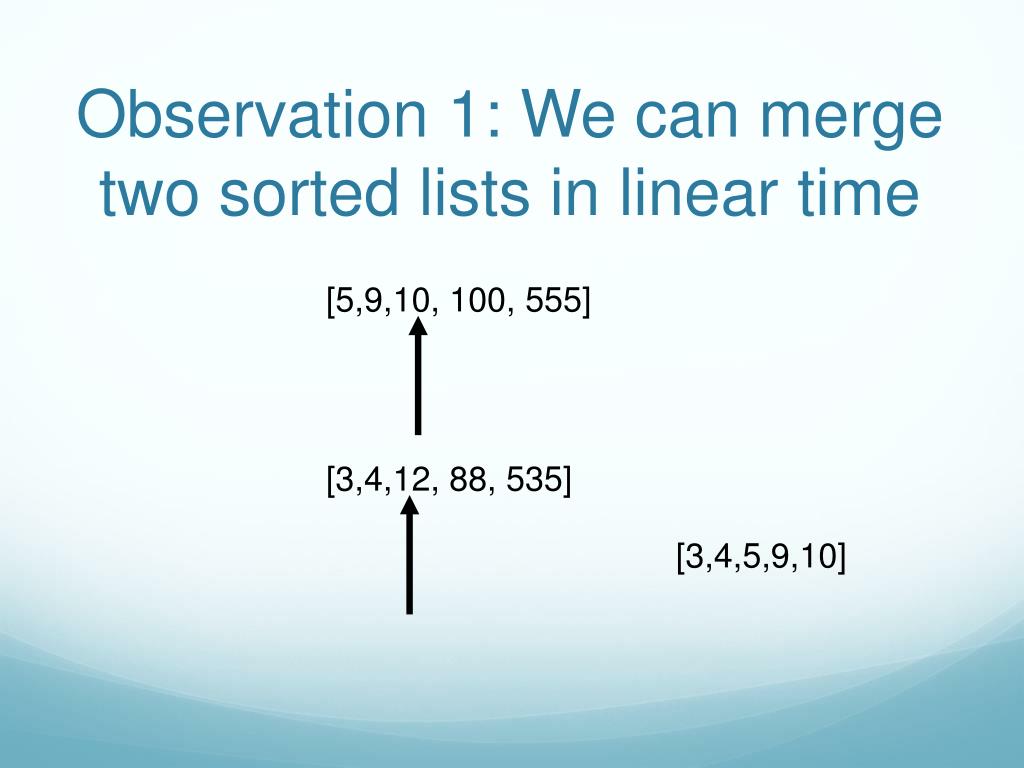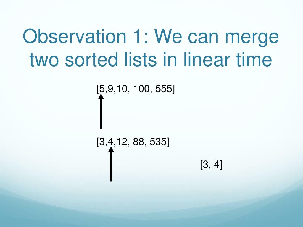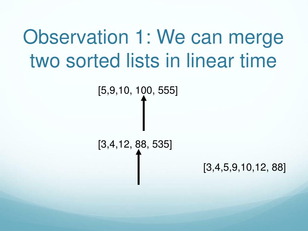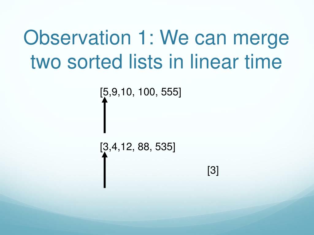 Observation 1: We can merge two sorted lists in linear time [5,9,10, 100, 555] [3,4,12, 88, 535] [3,4,5,9]