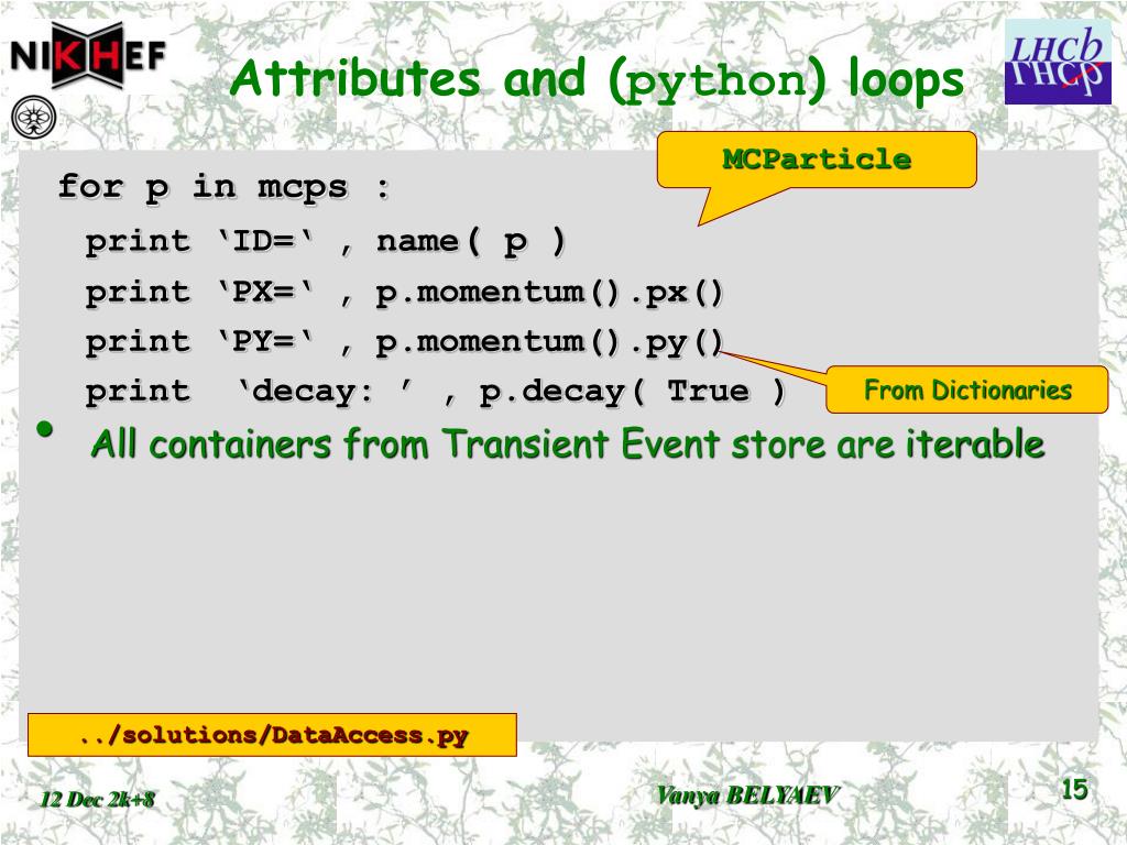 Attributes and (python) loops MCParticle for p in mcps : print ‘ID=‘ , name( p ) print ‘PX=‘ , p.momentum().px() print ‘PY=‘ , p.momentum().py() print ‘decay: ’ , p.decay( True ) • All containers from Transient Event store are iterable From Dictionaries ../solutions/DataAccess.py Vanya BELYAEV