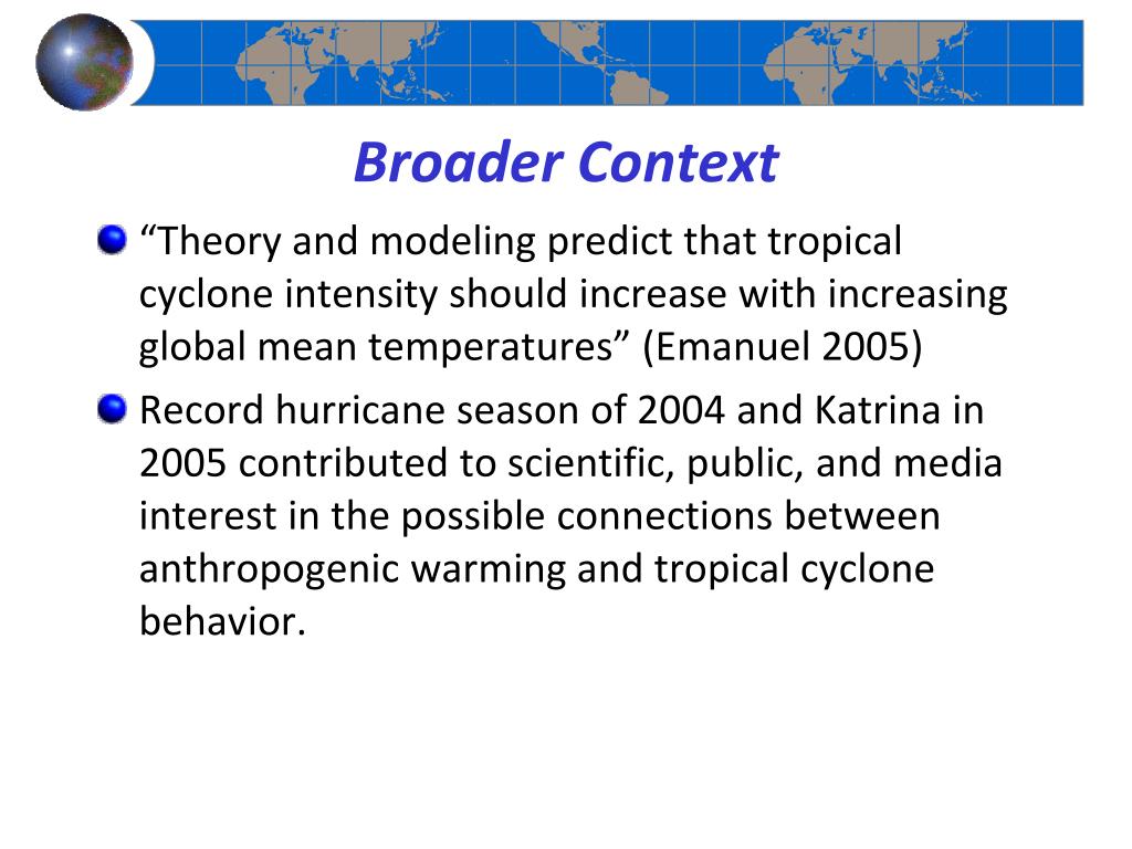 Broader Context • “Theory and modeling predict that tropical cyclone intensity should increase with increasing global mean temperatures” (Emanuel 2005) • Record hurricane season of 2004 and Katrina in 2005 contributed to scientific, public, and media interest in the possible connections between anthropogenic warming and tropical cyclone behavior.