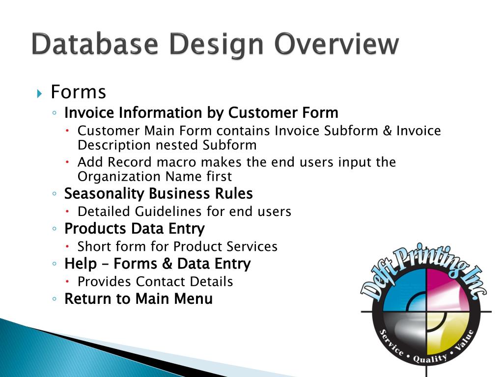 Database Design Overview • Forms • Invoice Information by Customer Form • Customer Main Form contains Invoice Subform & Invoice Description nested Subform • Add Record macro makes the end users input the Organization Name first • Seasonality Business Rules • Detailed Guidelines for end users • Products Data Entry • Short form for Product Services • Help – Forms & Data Entry • Provides Contact Details • Return to Main Menu