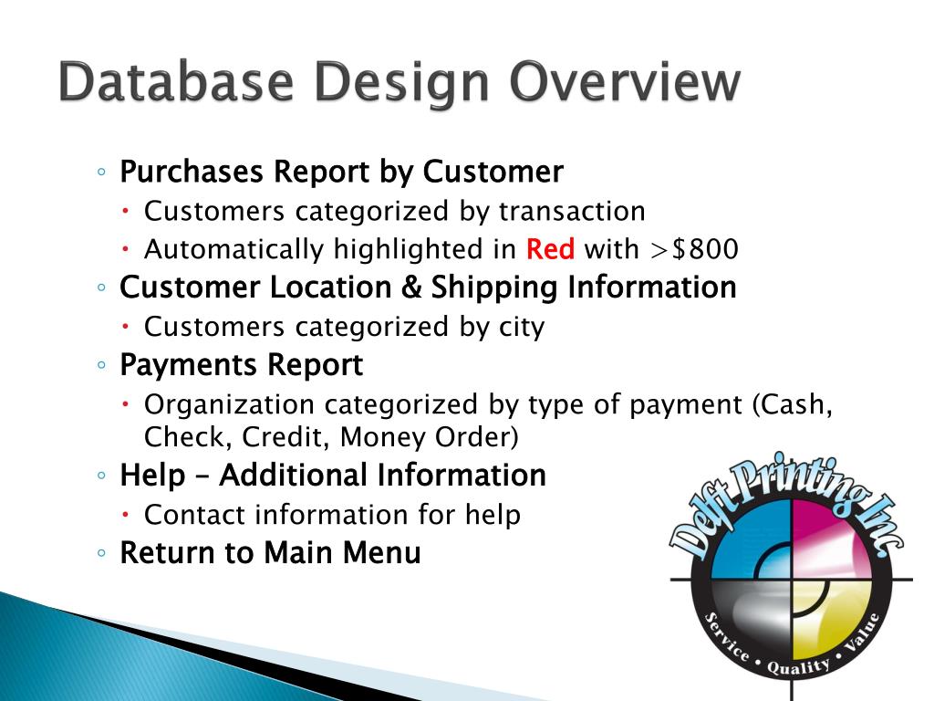 Database Design Overview • Purchases Report by Customer • Customers categorized by transaction • Automatically highlighted in Red with >$800 • Customer Location & Shipping Information • Customers categorized by city • Payments Report • Organization categorized by type of payment (Cash, Check, Credit, Money Order) • Help – Additional Information • Contact information for help • Return to Main Menu