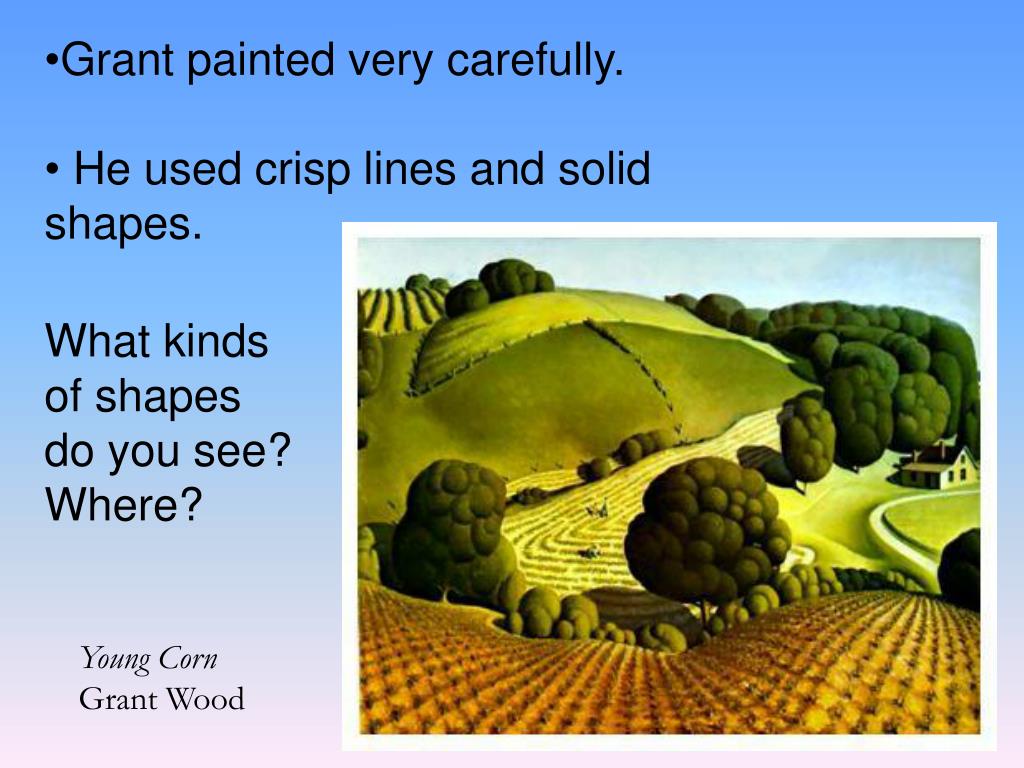 Grant painted very carefully. • He used crisp lines and solid shapes. What kinds of shapes do you see? Where? Young Corn Grant Wood