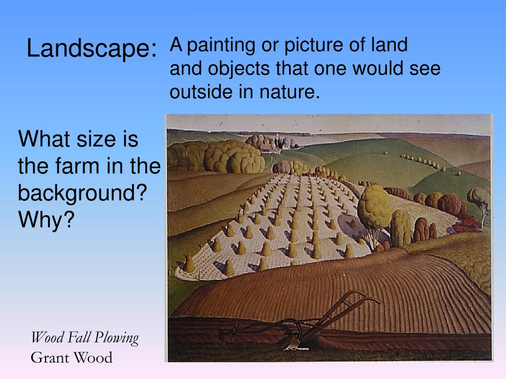 Landscape: A painting or picture of land and objects that one would see outside in nature. What size is the farm in the background? Why? Wood Fall PlowingGrant Wood